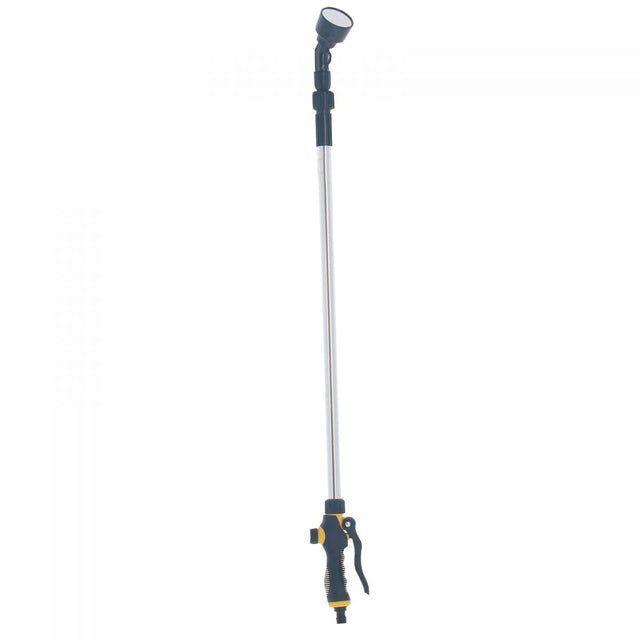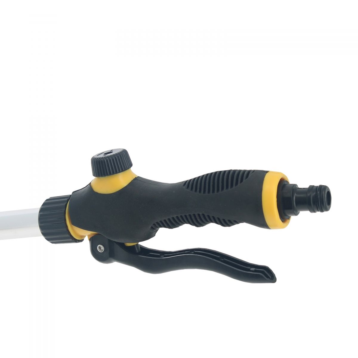 Elle se compose d'un manche en alu de 70 cm et télescopique jusqu'à 1.25 mètres. A son extrémité se trouve une poignée ergonomique en caoutchouc anti-dérapante avec gâchette et d'une molette de réglage du débit d'eau.